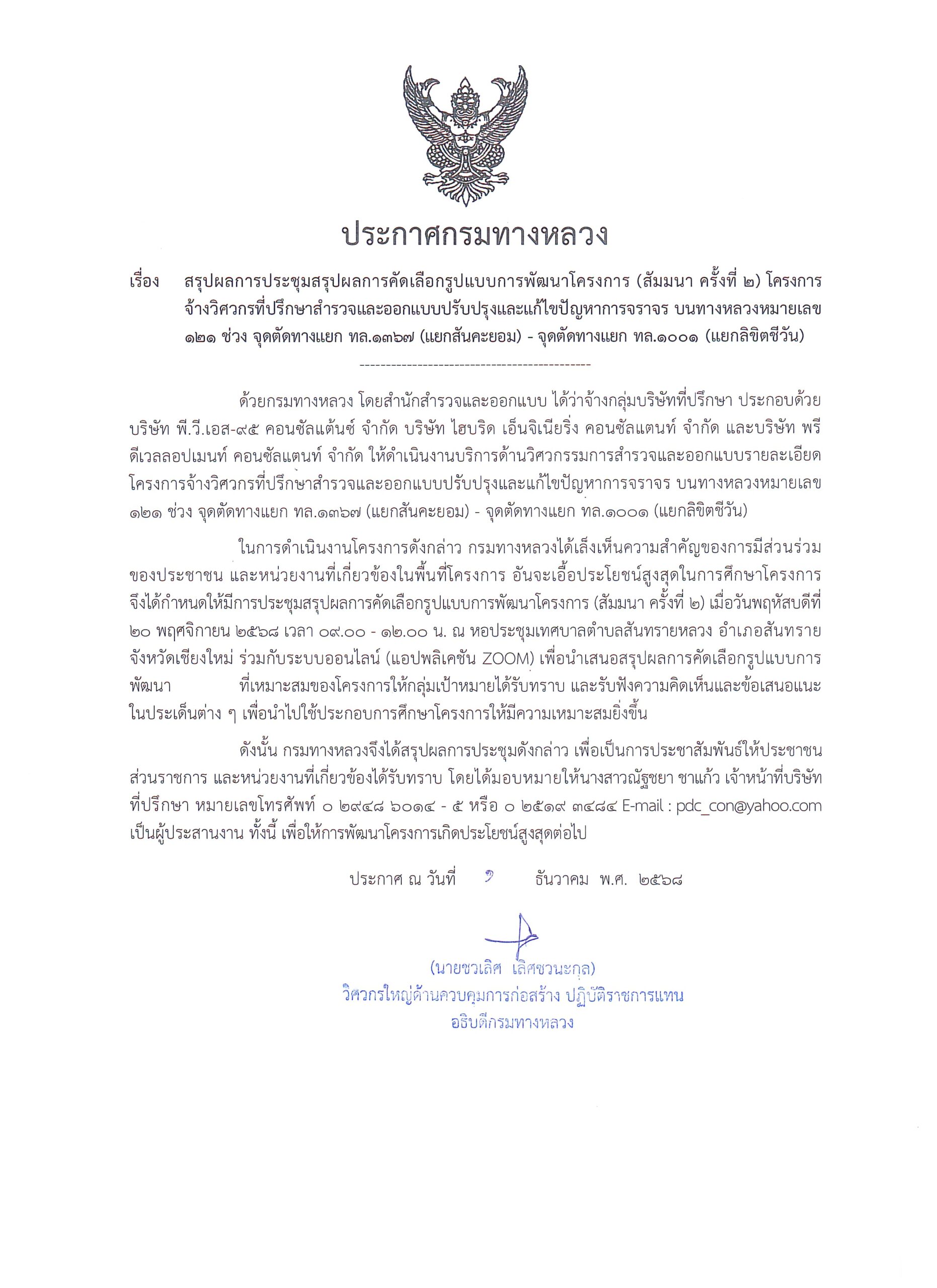 โครงการจ้างวิศวกรที่ปรึกษาสำรวจและออกแบบปรับปรุง และแก้ไขปัญหาการจราจรบนทางหลวงหมายเลข 121 แยกสันคะยอม - แยกลิขิตชีวัน